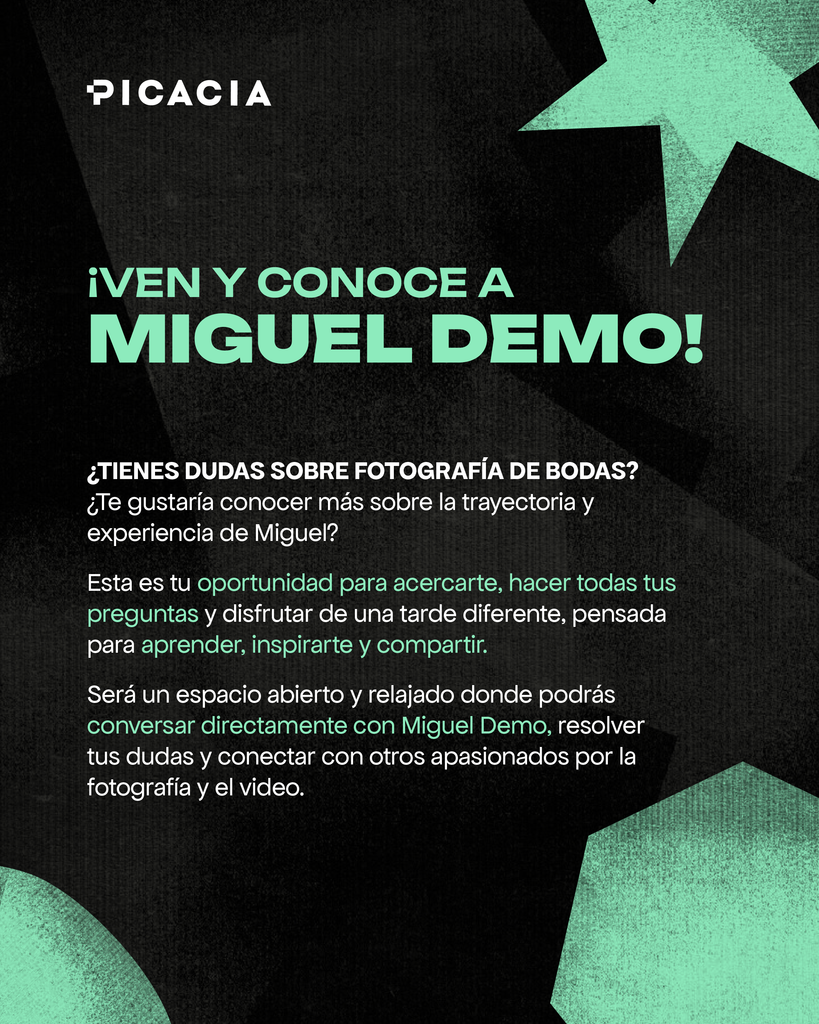 Será una oportunidad para platicar directamente con Miguel, conocer su trayectoria, entender cómo ha construido su camino en la fotografía y escuchar las historias detrás de su trabajo documentando bodas en distintos lugares.