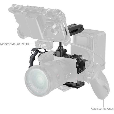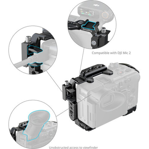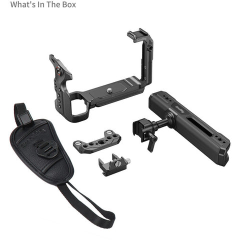El kit básico de jaula para cámara SmallRig con asa superior giratoria incluye una jaula completa diseñada para la Sony FX2, una placa superior desmontable, una abrazadera para cable HDMI, una correa de muñeca y un asa superior giratoria.