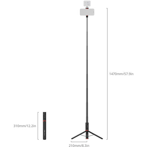 Es un soporte versátil para smartphones, diseñado para adaptarse perfectamente a diversas condiciones de grabación. Su ajuste de longitud flexible y continuo permite extenderlo sin esfuerzo de 31,1 a 145,7 cm para adaptarse a una amplia gama de necesidades de grabación.